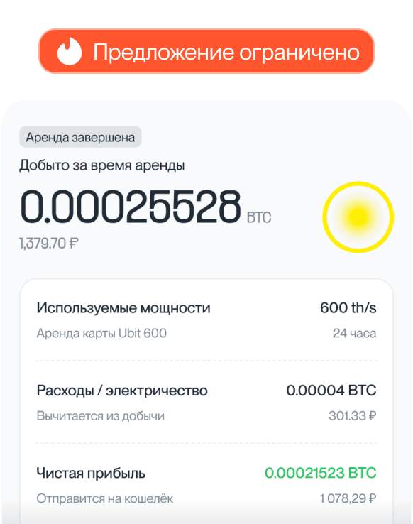 Оформите аренду мощностей в 1 клик и протестируйте работу платформы. Через 24 часа вам будет начислен добытый Биткоин.