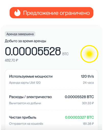 Оформите аренду мощностей в 1 клик и протестируйте работу платформы. Через 24 часа вам будет начислен добытый Биткоин.